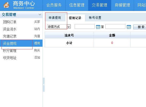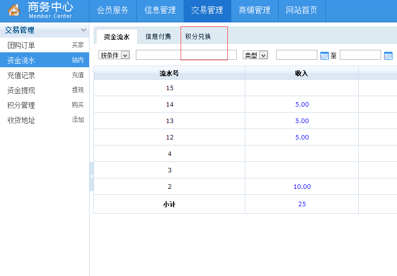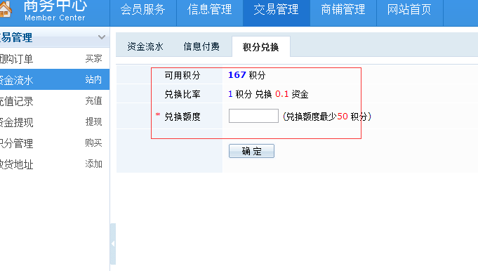 1、登录后进入商务中心,点击交易管理,再点击 资金流水,然后点击积分兑换