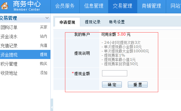 4、在申请提现界面输入提现金额,提交即可。本站目前提现设置如下: