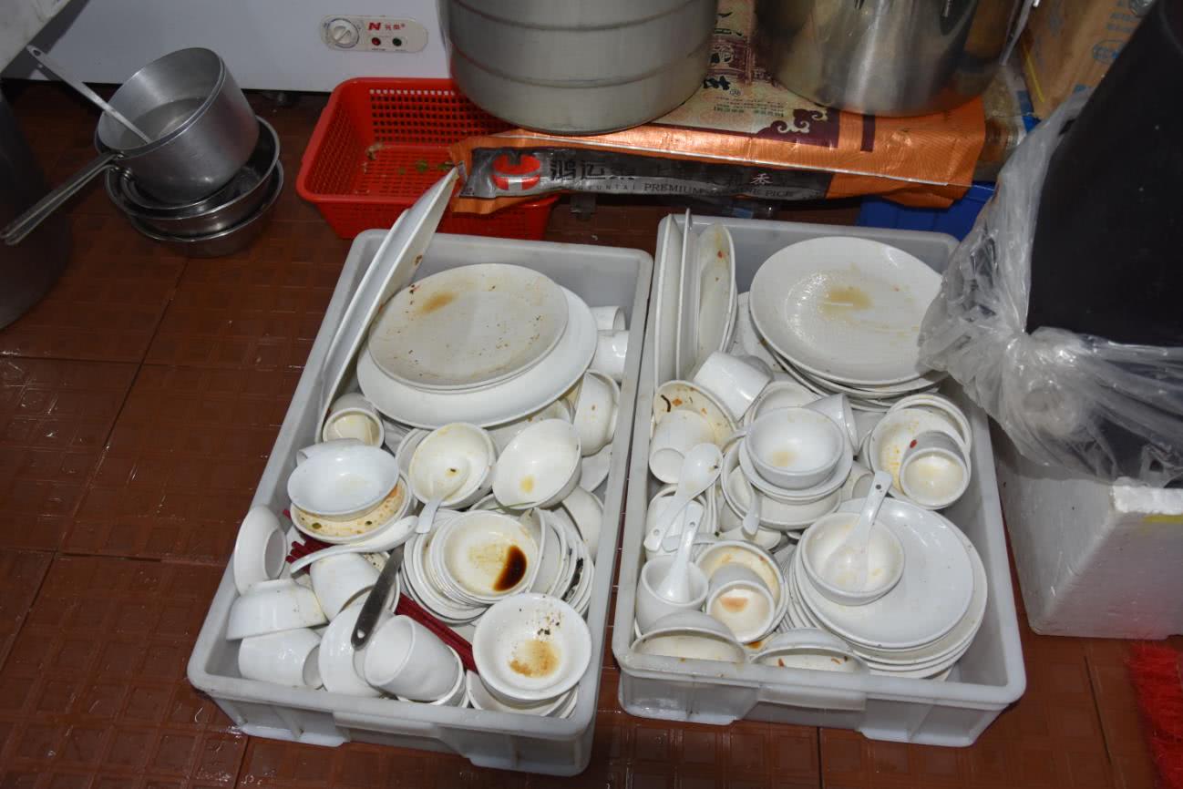 (餐具在地方散乱放置,不符合要求)