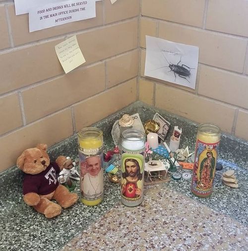 此后的两周时间里,同学们纷纷用各自的方式向这只蟑螂表达了“哀悼”。他们不仅在它身旁摆上了蜡烛、玩具熊、瓶盖等奇奇怪怪的物件,还在墙上贴满了怀念这只蟑螂的诗歌。一位牛人甚至为它“量身定制”了一副精巧的小棺材