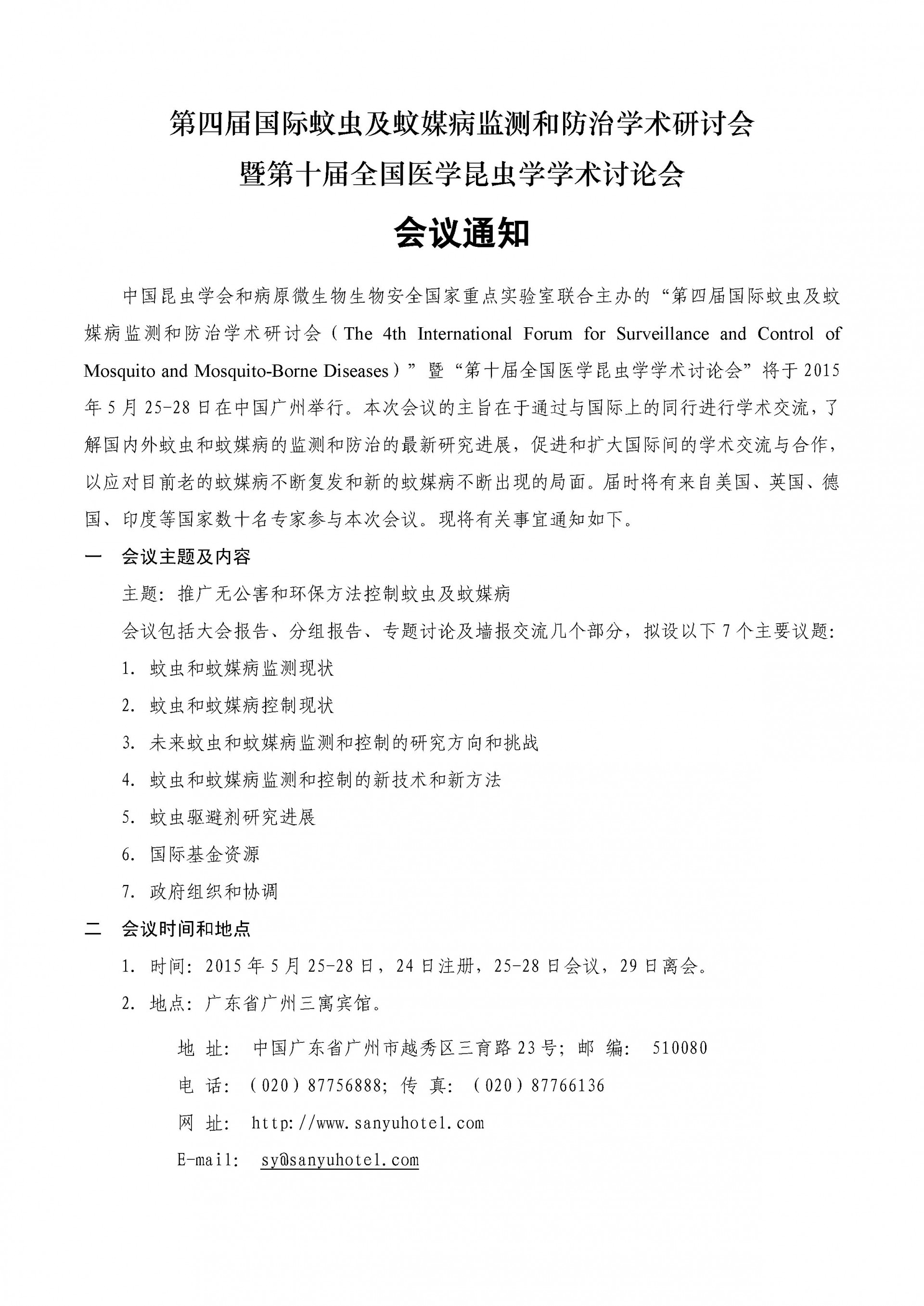 第四届国际蚊虫及蚊媒病监测和防治学术研讨会会议通知