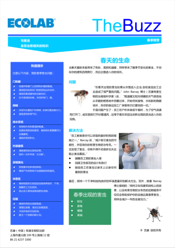 随着春节假期的结束,虫害入侵即将开始。由于今年冬天北方气温比往年要高,有些虫卵不能有效冻亡,所以2016年虫害问题要严重。上班后,记得检查、完善虫害控制设施。艺康文件
