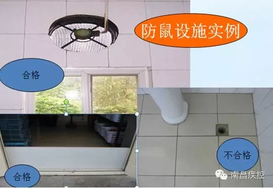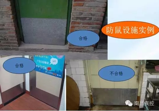 当然,光靠投鼠药来灭鼠是远远不够的,防鼠设施必须符合要求,小家鼠的头可以通过6 mm × 6 mm孔洞和6 mm的缝隙,因此防小家鼠的技术参数定为不能封闭的与外环境相通的孔、洞、缝等,应用间隔< 6 mm金属栏栅或< 6 mm × 6 mm金属网封堵,门与地面和门与门框间缝隙< 6 mm。能防小家鼠的参数值 ,显然能防大鼠。再者褐家鼠和黄胸鼠不助跑能垂直跳过60cm,小家鼠能跳过30 cm。褐家鼠和黄胸鼠立身能啃食20~25 cm高的门与门框 ,群体中大的个体立身可30 cm。因此防鼠设施的参数要求是食品库房挡鼠板高度应> 60 cm或厨房及库房等通向外环境的木质门和门框的下部镶金属板高度应> 30 cm。