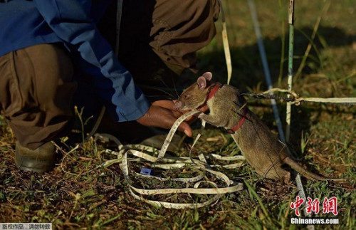 中新网6月21日电 据外媒报道,近年来,不少老鼠被用于地雷探测。这些老鼠经过专业训练后,可准确嗅到地下的地雷,为人类排除隐患。主推“老鼠排雷”项目的是一个名为APOPO的非政府组织,日前该组织就公布了老鼠接受训练的部分照片。