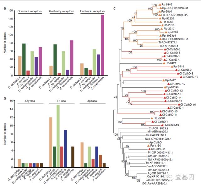 a:多种昆虫的化学受体相关基因;b:多种昆虫的唾液功能相关基因;c:多种昆虫组蛋白酶D构建的系统进化树。