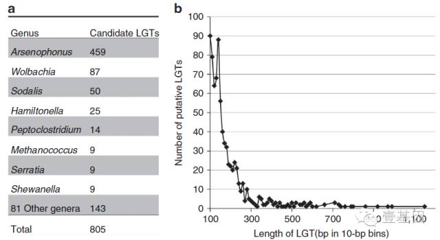 a:鉴定的候选LGTs数量;b:候选LGTs的长度。