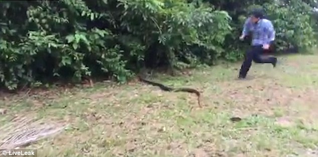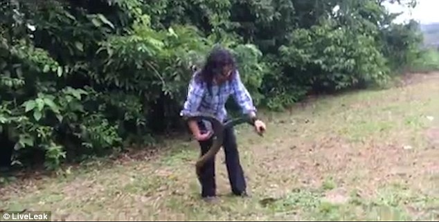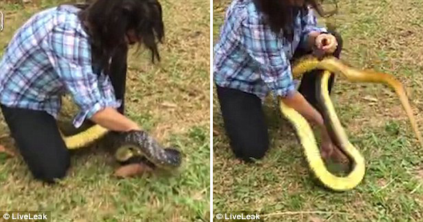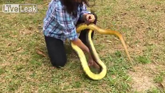 视频显示,当时,这条长蛇正在草地上快速地游走,眼看它马上就逃进旁边的篱笆丛里。突然,这名女子猛地窜出来,扑到地上,一只手捏住蛇头,另一只手抓住蛇身,将其成功擒获。