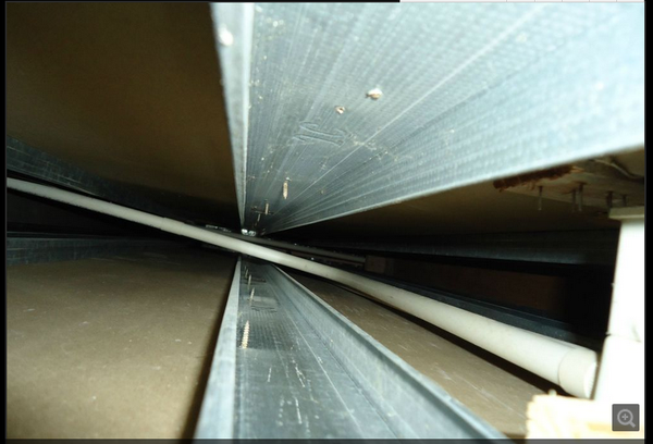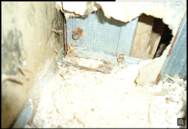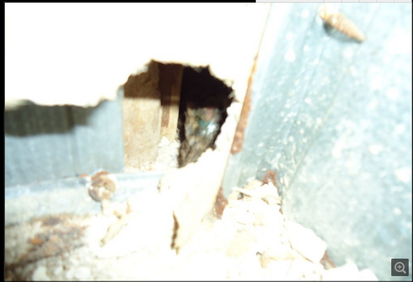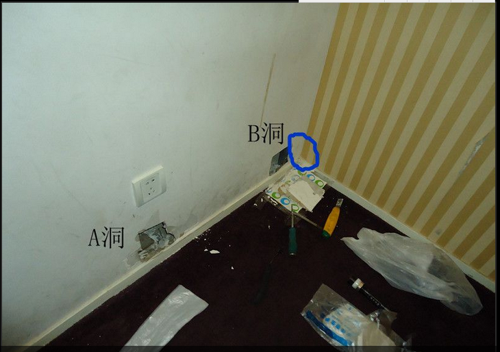 打开A洞时恶臭迎面扑来,可以肯定老鼠就在这墙壁里,可为什么就是找不到呢?急呀!反反复复折腾了一个多小时,还是没找到。她们到点要下班了,我也只好撤了。回到家后把拍的照片传电脑上,放大仔细分析,最后觉得右边画圈处很可疑,死老鼠很可能就在这里。第二天直接开B洞,然后把相机放进去拍照,果然发现了那可恶的老鼠。
