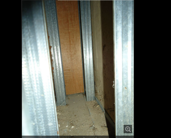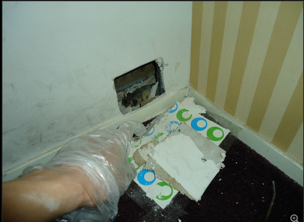 走到门口站了一会,呼吸了几口新鲜空气,又重新回到店内查找。由于通风的原因,店内已经不是很臭了,但走道那里还能明显闻到臭味,可以初步判定死老鼠就在走道附近。可走道一目了然只有上方的吊顶和左右侧的墙壁,没有任何看不到的地方。吊顶上面已经通过检修口找过了,没有任何发现,就剩下两侧的墙壁没找了。用手敲敲两侧墙壁,发现右侧的墙壁是空的,这空心墙的另一侧是一个美容间(美容间里也有臭味,但没有走道里气味浓),有种直觉老鼠就死在这空心墙里。把鼻子靠近空心墙壁上的插座一闻,果然臭味更浓了。心中暗喜,觉得问题把上就要解决了,但拆开插座后只是臭味更重,并没有发现死老鼠,而且由于插座距离地面有一段高度,角度的原因不能查看到空心墙里全部空间,没办法只好找店长协商要求在墙壁上开洞。通过一番协商,店长终于同意在美容间那侧开洞,这样影响小点。