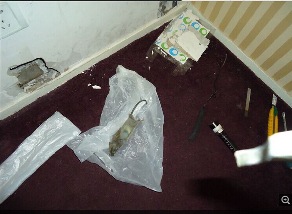 cript>cript>这么刁钻的角度,夹子是不好用了,只能用手把它捞出来。老鼠尸体已经发涨卡在洞里面,把拿出来也不容易,半张老鼠皮都撸掉了。