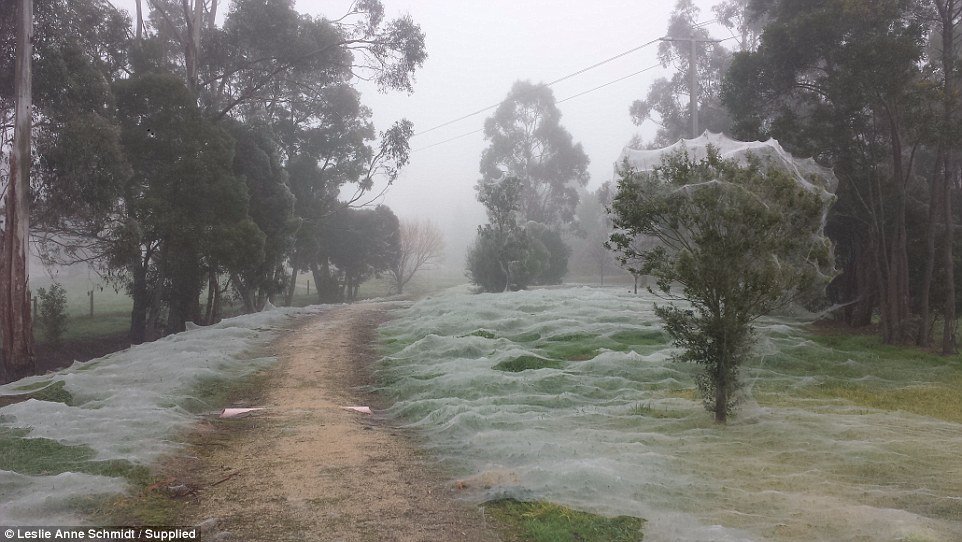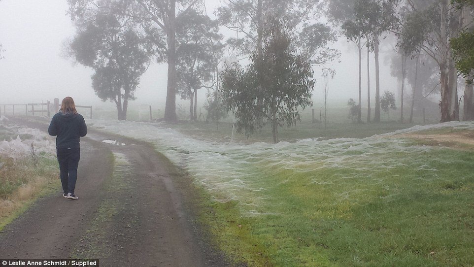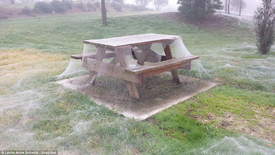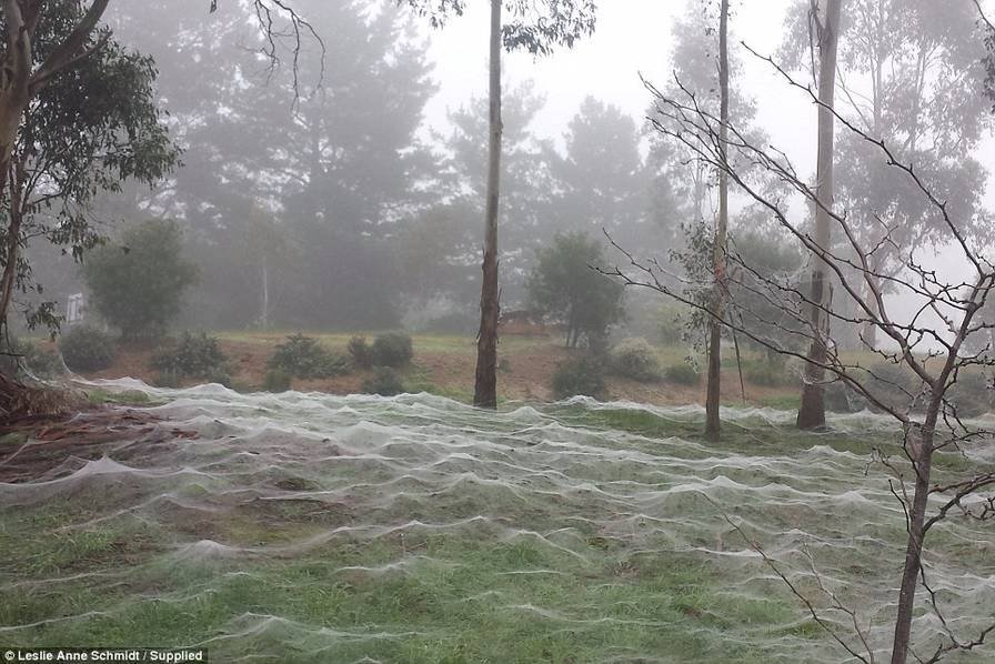 据悉,这是因为这几天维州连降大雨,数百万蜘蛛为了从洪水中保命,才采取往高处织网的方式来帮助迁徙,这才在这个公园里留下了密密麻麻的蜘蛛网。