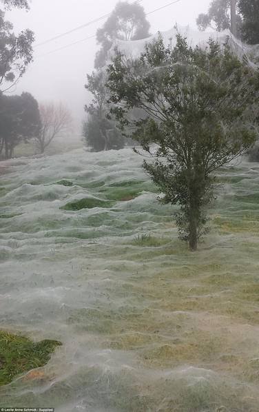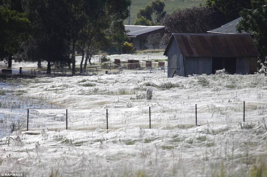 2012年,沃加沃加,一场大雨过后,大量的吐着丝的蜘蛛“从天而降”,地面也覆盖了一层厚厚的蜘蛛网。