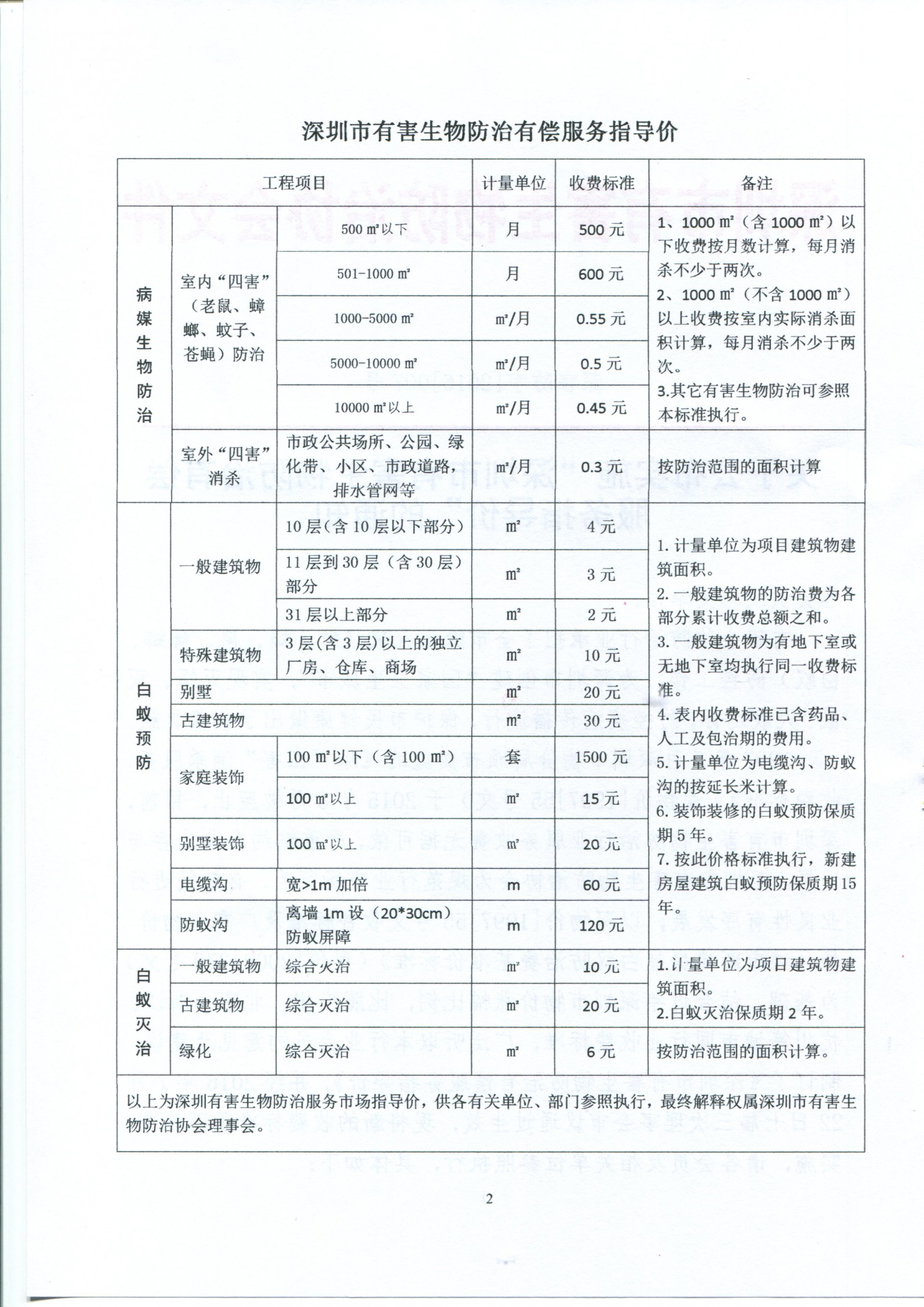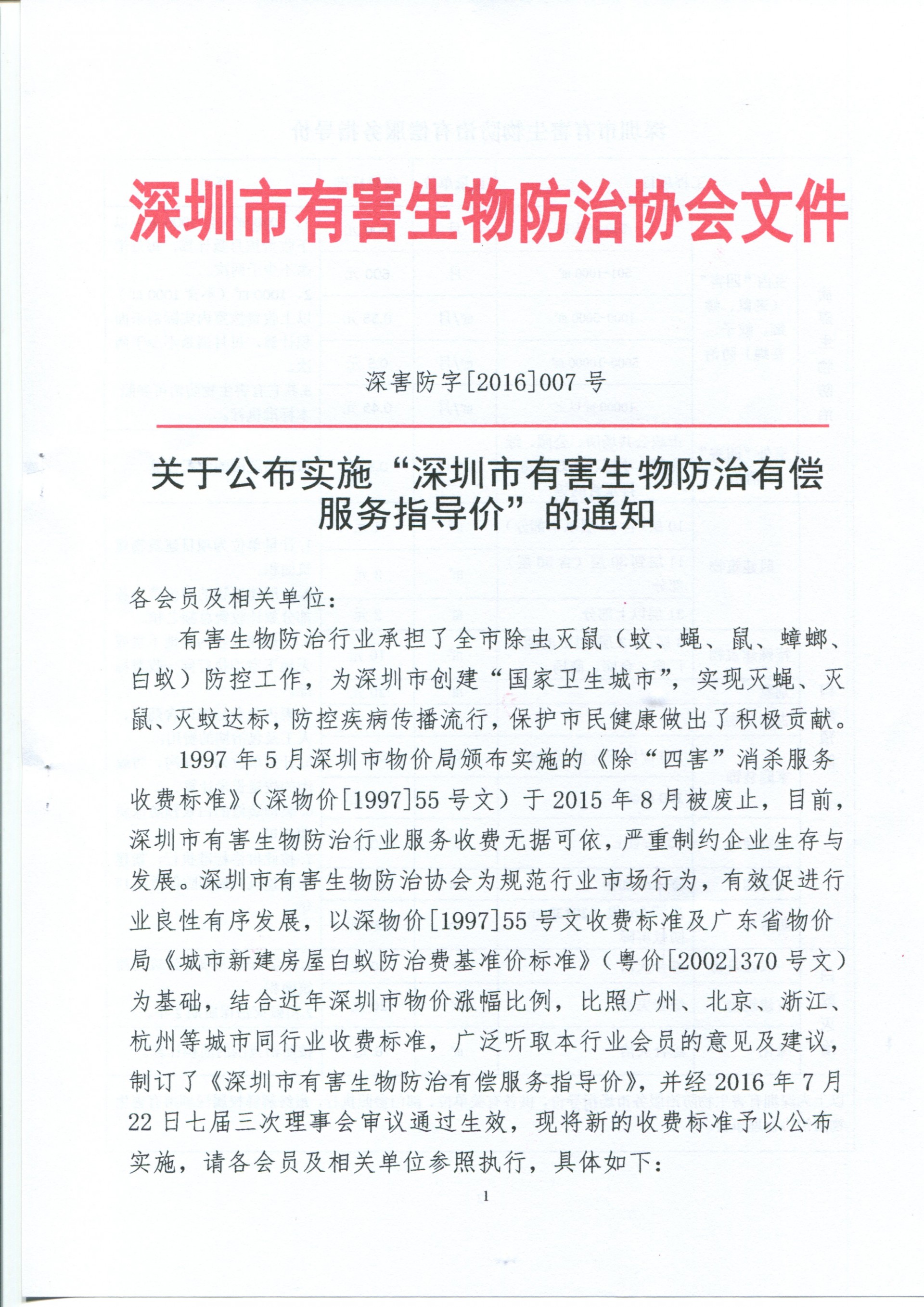 关于公布实施深圳市有害生物防治有偿服务指导价的通知:1997年5月深圳市物价局颁布实施的除四害消杀服务收费标准深物件1997 55号文于2015年8月被废止,目前,深圳市有害生物防制行业服务收费无据可依,严重制约企业生存与发展,深圳市有害生物防治协会规范市场行为,有效初进行业良性有序发展,具体看公告文件