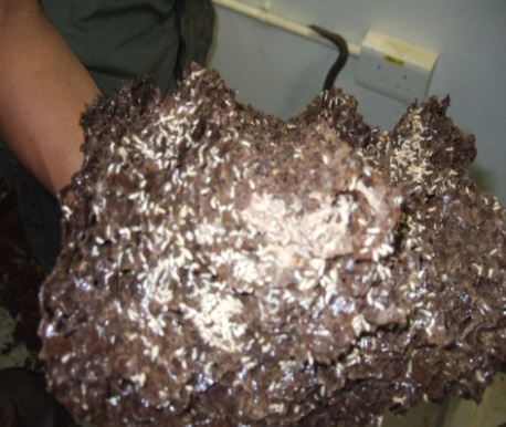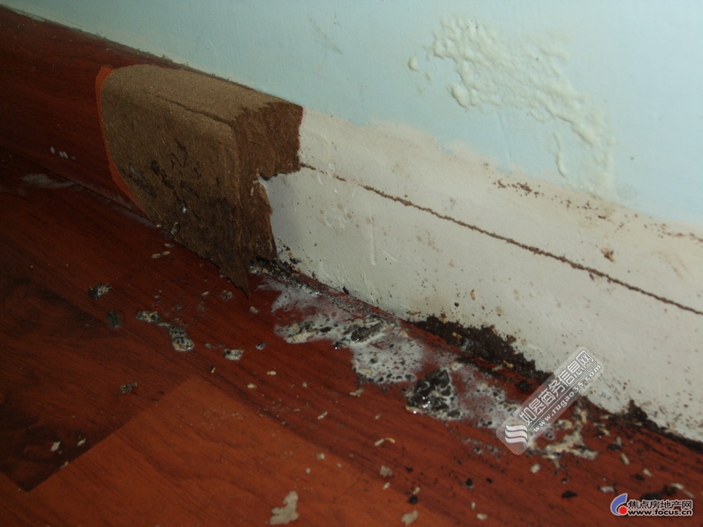 周先生说,前几天每天在家扫地,大厅角落有好多的飞虫翅膀和暗褐色的飞蛾尸体。经过环保服务公司人员上门检查,没想到这些竟然就是台湾乳白蚁的繁殖蚁,俗称“大水蚁”。厦门鹭洁鑫环保公司施工员小邓指着墙壁的角落,一条小指般粗、暗褐色潮湿的泥巴线说,那就是白蚁的吸水线。他拿起螺丝刀撬开卧房衣柜内最底层的木板,下面居然藏着约2.5公斤重的蜂窝状的蚁巢,数以万计的白蚁在蠕动。