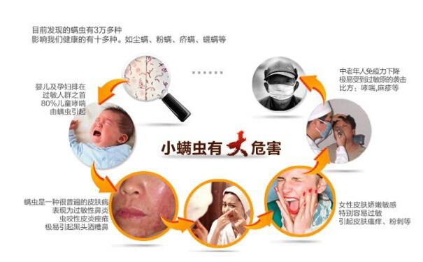 四季交替,是过敏性疾病的高发期,而螨虫就是引起过敏性疾病的罪魁祸首。螨虫是一种肉眼不易看见的微型虫害。当春季阳光开始变暖的时候,这些螨虫就开始兴风作浪了。其尸体、分泌物以及排泄物都是过敏原,从人体呼吸系统进入到人体内部或接触皮肤后,脸部可能出现红斑、毛孔扩大,皮肤粗黑、打喷嚏、流鼻涕、鼻塞、咳嗽、气喘等症状就都来了。