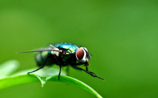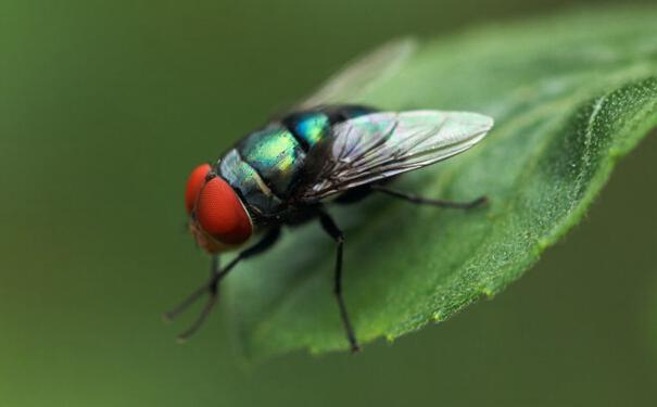 5、金蝇:体形较大而肥胖,体长7-11mm,全身有蓝绿色金属光泽,雄性头部两复眼巨大,呈鲜红色,复眼下1/3小眼面较小,上23小眼面较大,呈弧形,分界明显,两复眼间距很狭;雌性两复眼间距很宽,两性颊部呈桔黄色,下腋瓣呈褐色,其上有细毛,腹基部背片全黑,是喜室外性的居住区蝇种。
