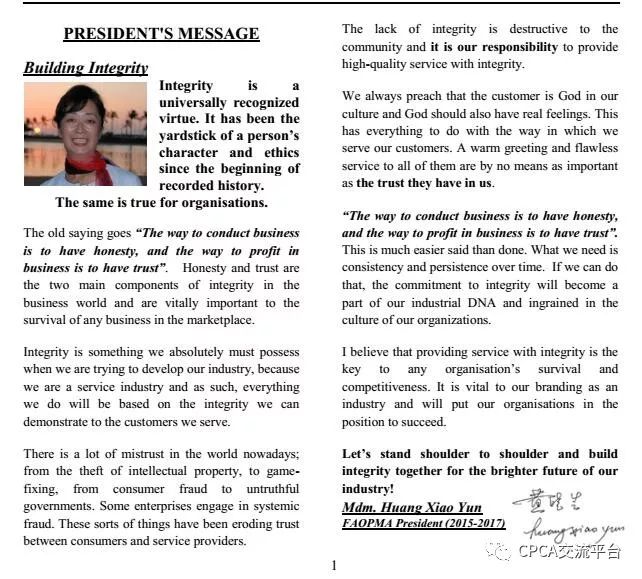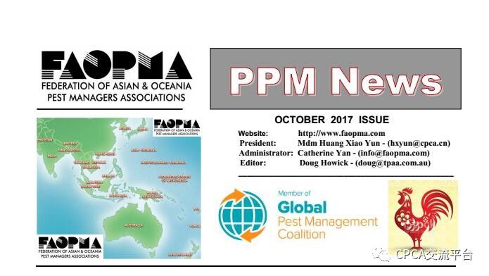 (亚洲及大洋洲地区害虫管理协会联盟轮值主席、中国卫生有害生物防制协会副会长兼秘书长 黄晓芸在2017年10月亚大区刊物《PPMnews》亲笔卷首语)