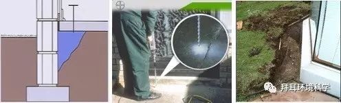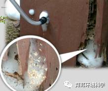 根据《房屋白蚁预防技术规程》要求,利用专门的喷洒工具,在建筑物新建、改建、扩建、装饰装修时,对地基、四周、基础墙两侧、柱基、桩基、变形缝、地下电缆 沟、管进等处的土壤中施用白蚁药物,形成一道化学屏障,从而阻止(毒杀和驱避)白蚁穿透含药土层。施用驱避性药剂时,要求处理周到不留无药间隙,但很难做 到(如下图所示)。
