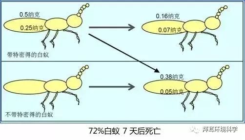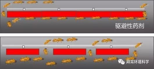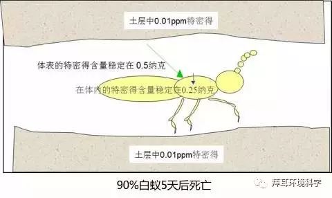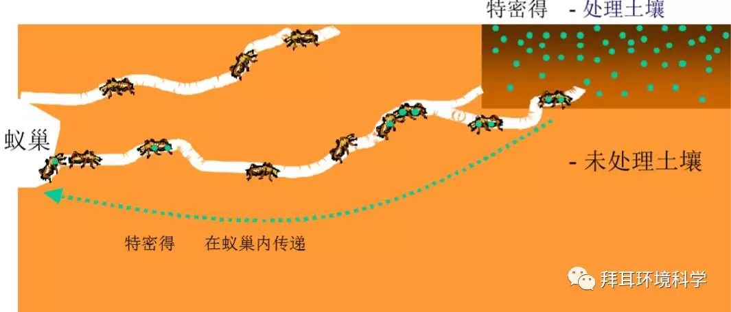 若选用非驱避性药剂(如特密得®)施用于土壤,不仅可以毒杀阻挡白蚁侵入,同时当白蚁穿透低含药量土层时,传毒至蚁巢,杀灭蚁巢。