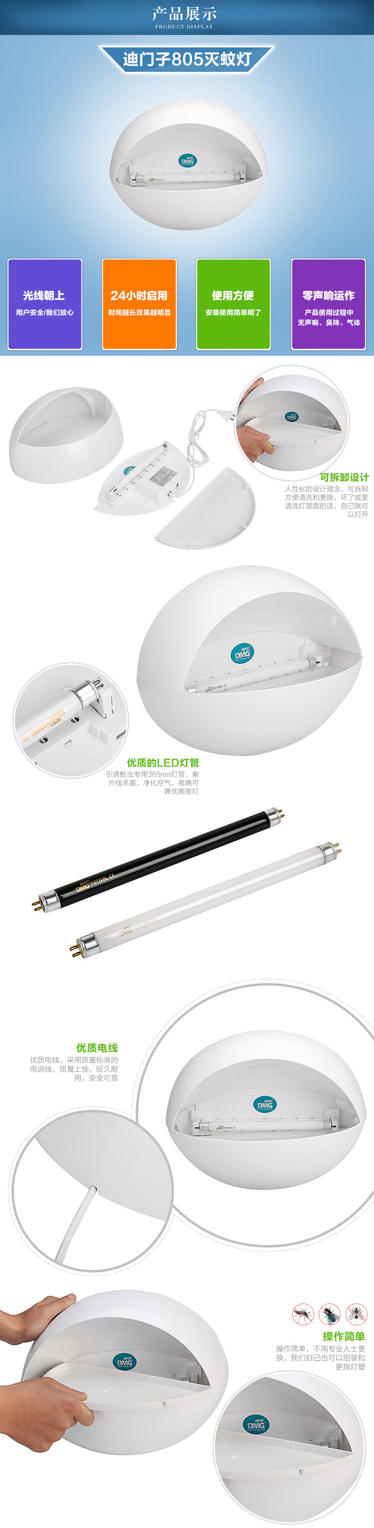 | 一、本品为粘捕式灭蚊蝇灯,对蚊蝇均有显著效果。本品采用专用诱捕功能性灯管:选用光频诱捕功能效果好,寿命长,高质量和工作稳定性强的灯管,因为灭蚊灯灯管是功能性灯管,具备这些特点是捕杀蚊蝇的前提条件。我们采用的全部是质量最好、具有特殊光频的灯管,这种灯管不仅可以吸收有害短波UV-B和UV-C光,并且发出良性的长波UV-A光和一些蓝光和蓝紫色光,这种灯管散发出来的UV-A光对人体无害,因为灯管做了特殊磷层处理,可以吸收掉有害部分,同时保证了对苍蝇等飞虫致命的吸引作用。灯管在全天候24小时、一周7天的使用条件下,产品灯管光频从第八个月后才开始渐渐衰减,而且衰减速度非常慢,在一年内的有效性衰减率几乎可以忽略不计.本产品灯管光频在6个月内的有效衰减率几乎可以忽略不计;使用本灯管,既可以保证您的使用环境飞虫问题得到有效控制,又可以减少您更换灯管的频率,为您减少成本。您无需担心因为短时间内没有及时换灯管而使您的环境遭受飞虫的困扰,更甚者导致此间飞虫的污染引起您更大的损失。捕杀范围广,可捕杀蚊子、苍蝇、飞蛾……还能捕杀其它极微小飞翔微生物等虫. 二、优质镇流器故障率低,寿命长。带有电压保护功能的镇流器,因为对于电压的上下波动范围,全部采用电子式控制方式,其使用寿命比市场上大部分同行业灭蝇灯产品都长。