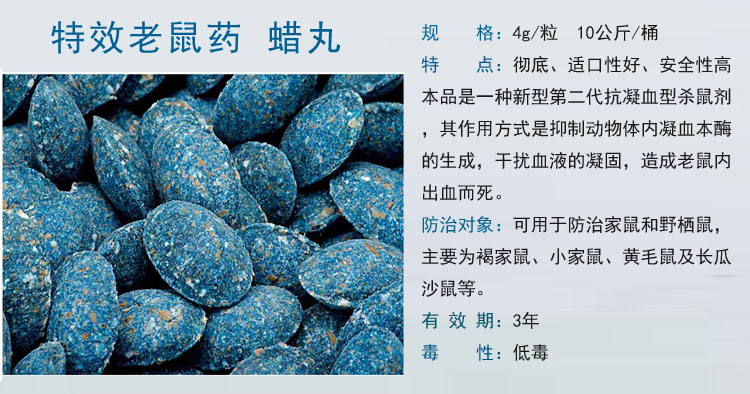 3、使用方便,块状毒饵,无需事先拌毒饵;防霉防潮,防止虫蛀。