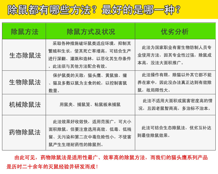 1、彻底灭鼠的最快途径。老鼠一次取食即达致死剂量,5~7天发生死亡,21天达到彻底灭鼠效果;适口性佳,易于迅速取食,对家鼠、野鼠均效果显著,对抗性品系同样具有效果。