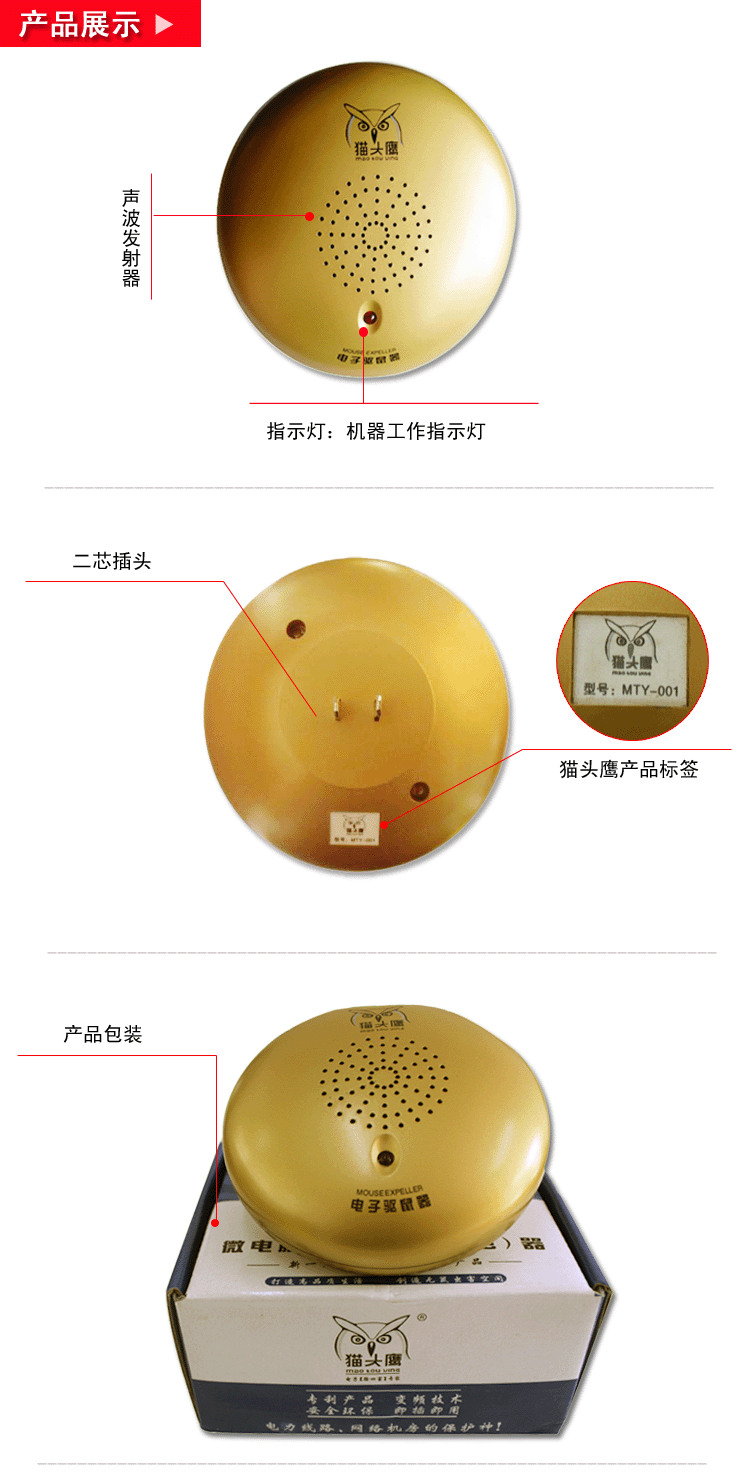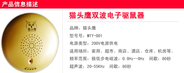 1、 复合型:本品可同时产生电磁波、超声波, 两种波迭加在一起产生的双重功效,所以本品是目前最先进、最综合的一款微电脑电子驱鼠(虫)器。
