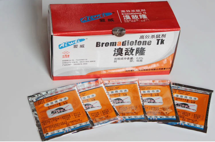 取0.5% 溴敌隆母粉1份,加6~8份水混匀后,与99份(稻谷、大米、玉米、小麦等)混合撑均匀、晾干后使用。