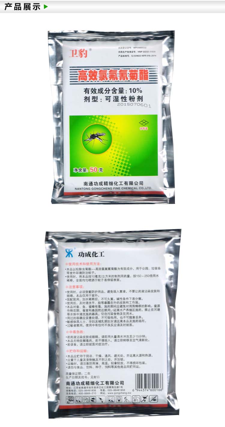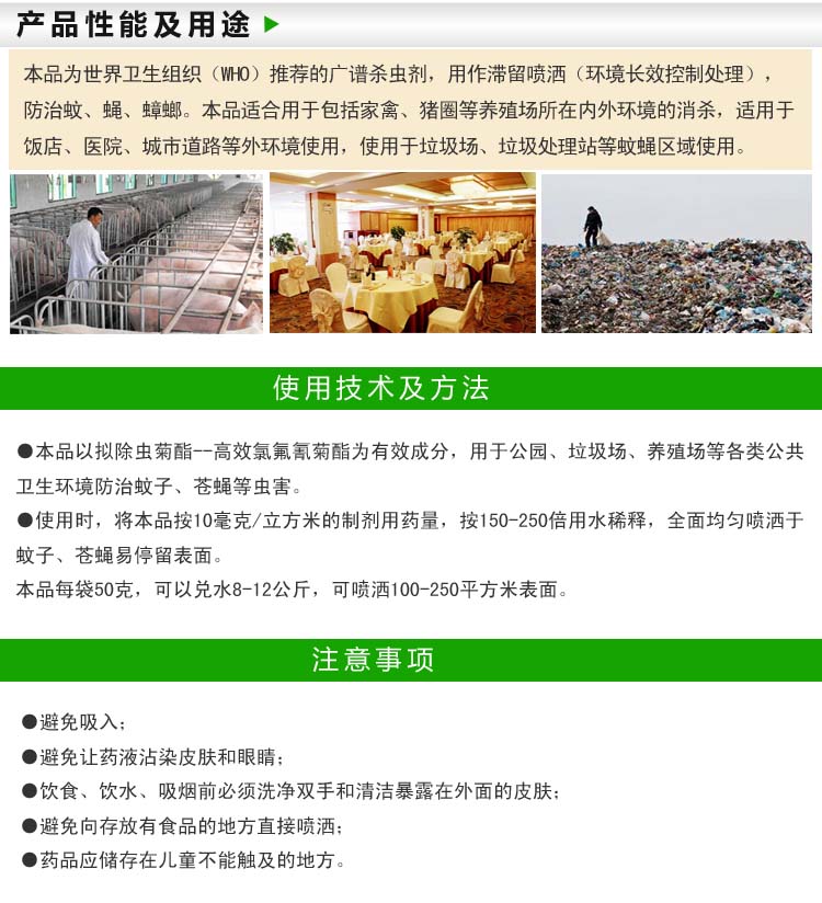 本品以拟除虫菊酯--高效氯氟氰菊酯为有效成分,用于各类公共卫生环境防治蚊子、苍蝇。