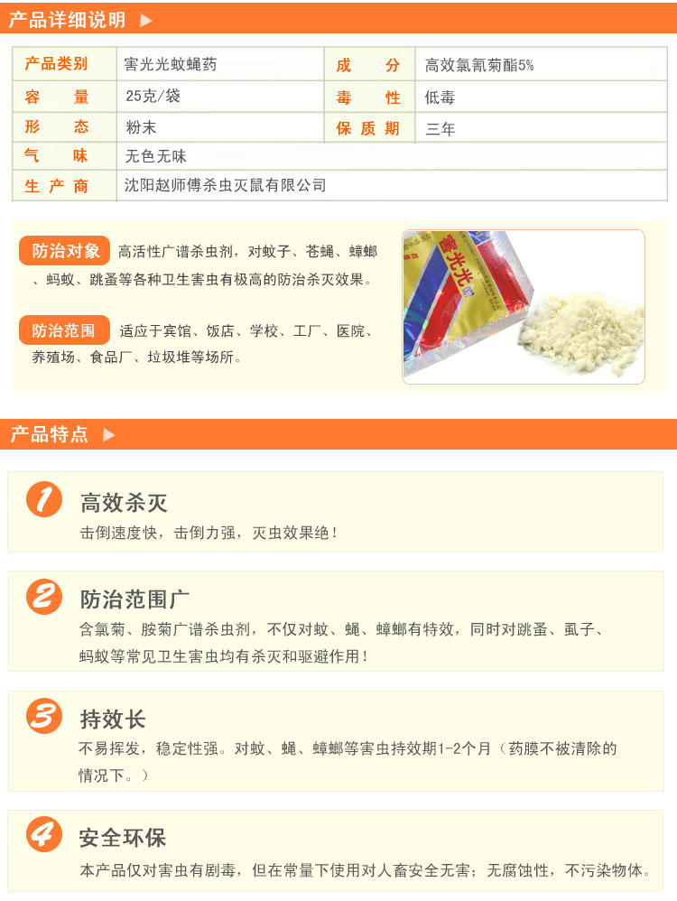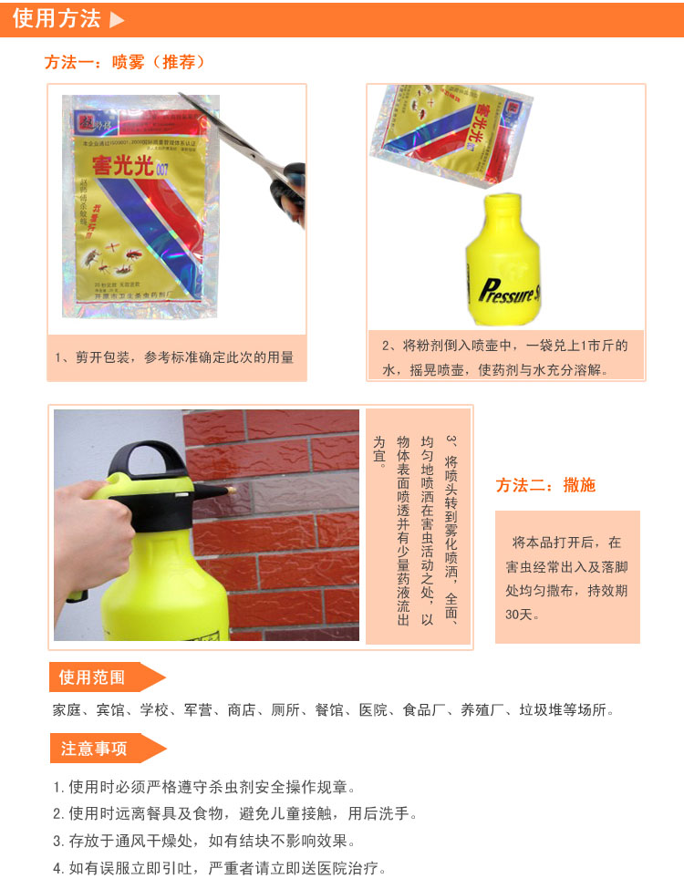 4、安全环保:本产品仅对害虫有剧毒,但在常量下使用对人畜安全无害;无腐蚀性,不污染物体。