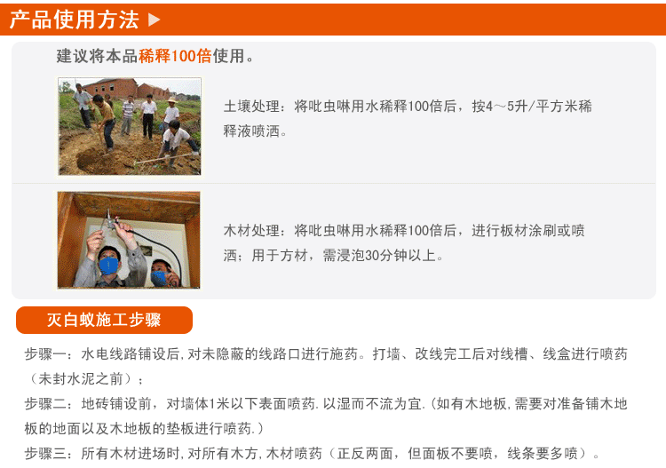 2、用此药按以上比例处理,防蚁有效期达十年以上。
