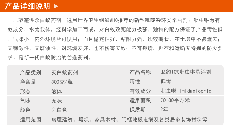 性能特点:非驱避性杀白蚁药剂。选用世界卫生组织WHO推荐的新型吡啶杂环类杀虫剂……吡虫啉为有效成分、水为载体,经科学加工而成,对白蚁致死能力极强。独特的配方保证了产品毒性低、气味小,内外环境皆可使用;而且稳定性好、粘附力强、残效期长,在土壤中不易流失;无刺激性、无腐蚀性、对环境友好,也不伤害天敌;不可燃烧,贮存和运输无特别的防火要求。是新一代白蚁防治的首选药剂。