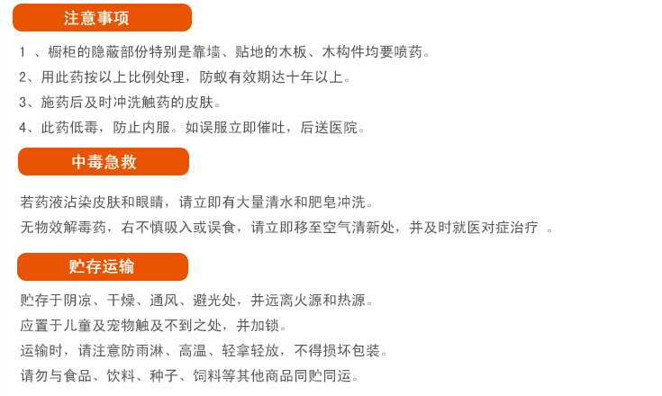 使用方法:土壤处理:将本品用水稀释100倍后,按4~5升/平方米稀释液喷洒。木材处理:将本品用水稀释100倍后,进行板材涂刷或喷洒;用于方材,需浸泡30分钟以上。