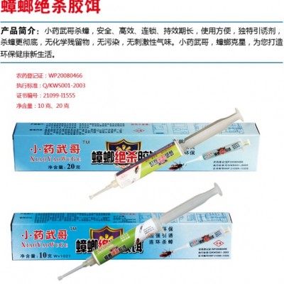 小药武哥蟑螂绝杀饵剂对各种场所蟑螂均有很好的杀灭率,适口性好、引诱效果极强、投药后即吃即死、杀灭迅速、无拒食现象、安全环保。室内沿墙根每隔15-30公分布点一个,蟑螂密度大时可增加投药量,水源、暖气附近、橱柜内、冰箱后、电气设备内部、桌柜门缝、墙缝及角落、孔洞隐蔽处、下水道两边等部位重点投饵。