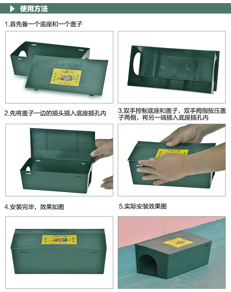 优质工程塑料制造,强度高,韧性好,独特的独特的防水设计,确保鼠药不易潮湿。