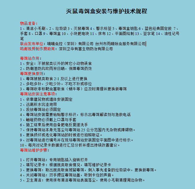 【本片内容】:本片介绍和演示毒饵站安装与维护sop视频教程,用于员工入职培训教育。