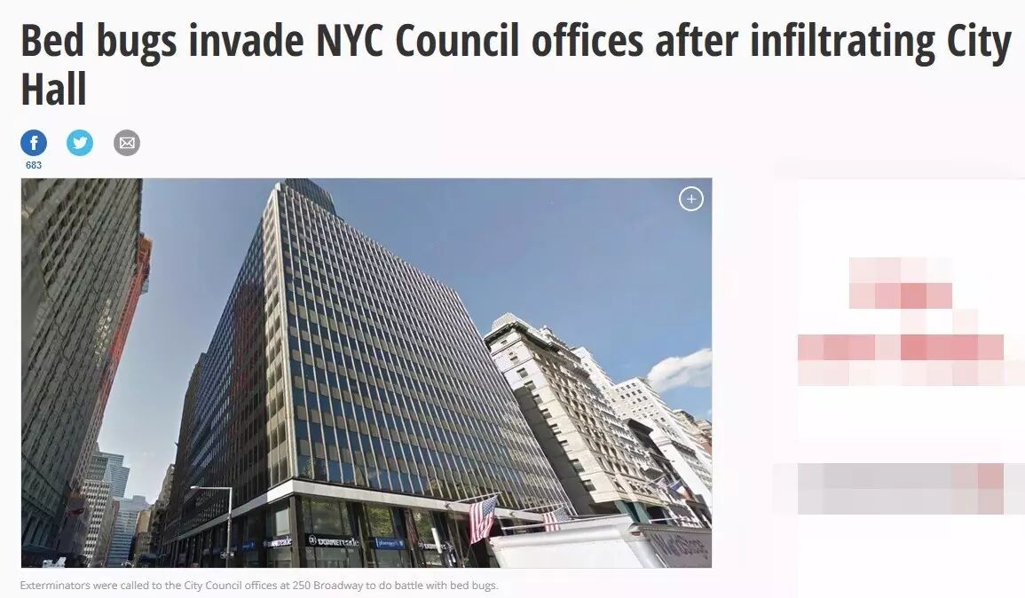 纽约每日新闻报道,位于曼哈顿下城百老汇250号的纽约市议会(City Council)是市政大楼中最新一座上周被臭虫入侵并祸害的。本周灭虫已在大举进行中,包括能嗅臭虫的探狗也已入驻。